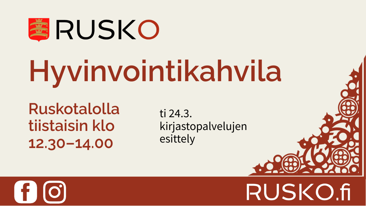 Hyvinvointikahvila käynnistyy Ruskotalolla Tervetuloa mukaan hyvinvointikahvilaan Ruskotalolle tiistaisin klo 12.30–14.00. Kahvitarjoilu. Ensimmäinen hyvinvointikahvila on tiistaina 24.3., jolloin ohjelmassa on kirjastopalvelujen esittelyä sekä vapaata seurustelua. Hyvinvointikahvilan ohjelma tarkentuu kevään aikana. Lämpimästi tervetuloa mukaan!